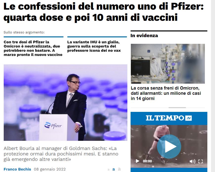 Τα παραπάνω φέρεται να ειπώθηκαν κατά τη διάρκεια τηλεδιάσκεψης που πραγματοποιήθηκε στις 6 Ιανουαρίου με επενδυτές της Goldman Sachs, σύμφωνα με δημοσίευμα της ιταλικής εφημερίδας Il Tempo με τίτλο “Οι εξομολογήσεις του νο1 της Pfizer: τέταρτη δόση και μετά 10 χρόνια εμβολιασμού”.