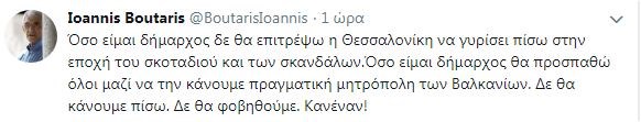 “Όσο είμαι δήμαρχος δεν θα επιτρέψω η Θεσσαλονίκη να γυρίσει πίσω στην εποχή του σκοταδισμού και των σκανδάλων. Όσο είμαι δήμαρχος θα προσπαθώ όλοι μαζί να την κάνουμε πραγματική μητρόπολη των Βαλκανίων. Δε θα κάνουμε πίσω. Δε θα φοβηθούμε. Κανέναν!”, γράφει ο κ. Μπουτάρης.