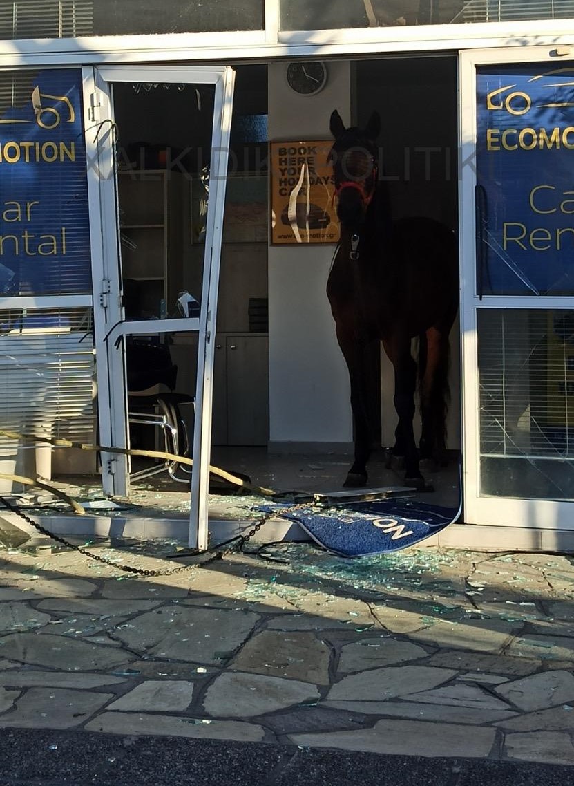 Τον πανικό σκόρπισε ένα άλογο στη Νικήτη Χαλκιδικής, όταν ξαφνικά μπούκαρε σε κατάστημα ενοικιαζόμενων αυτοκινήτων και τα έκανε «γυαλιά καρφιά».