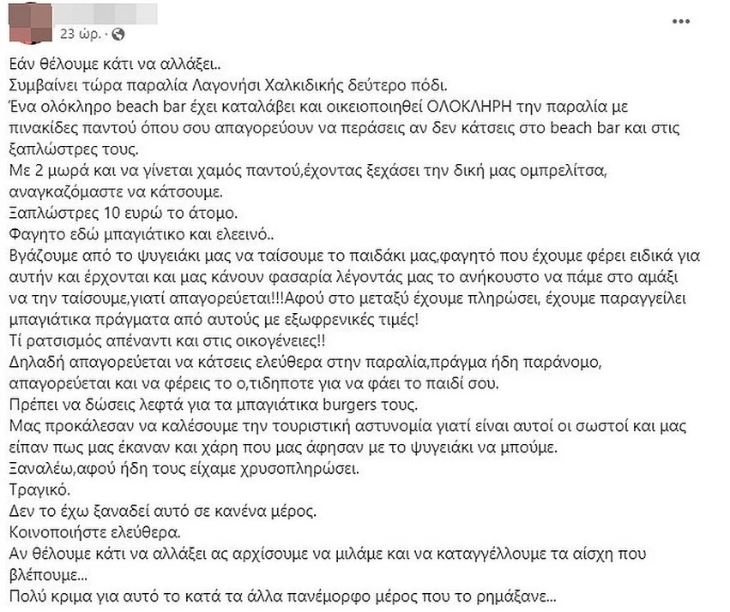 «Ένα ολόκληρο beach bar έχει καταλάβει και οικειοποιηθεί ΟΛΟΚΛΗΡΗ την παραλία με πινακίδες παντού όπου σου απαγορεύουν να περάσεις αν δεν κάτσεις στο beach bar και στις ξαπλώστρες τους.