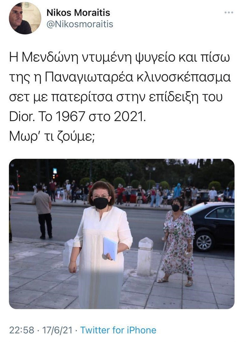Ο γνωστός στιχουργός έγραψε: “H Μενδώνη ντυμένη ψυγείο και πίσω της η Παναγιωταρέα κλινοσκέπασμα σετ με πατερίτσα στην επίδειξη του Dior. Το 1967 στο 2021. Μωρ’ τι ζούμε;”.