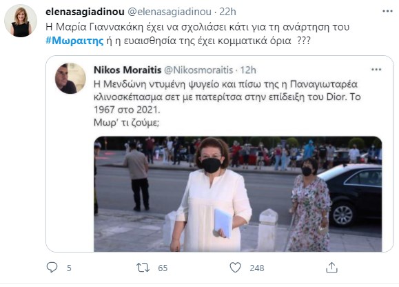 Ο Άδωνις Γεωργιάδης σχολίασε την ανάρτησή του λέγοντας ότι “ο @Nikosmoraitis διακωμώδησε το ντύσιμο δύο κυριών, της κας Μενδώνη και της κας Παναγιωταρέα και χλεύασε πρόβλημα υγείας της δεύτερης που την αναγκάζει να χρησιμοποιεί πατερίτσα. Αν αυτός δεν ήταν Αριστερός αλλά Δεξιός και αυτές κυρίες της Αριστεράς τί θα είχε γίνει; Υποκριτές!”.