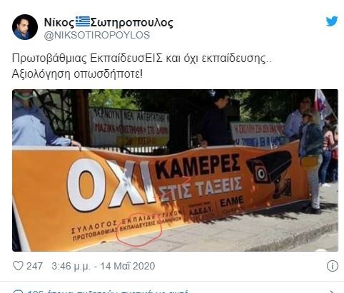 Μετά το «απέσυρε» και όχι «απόσυρε» του πανό στα σκαλιά της Βουλής, οι ιδιαιτέρως παρατηρητικοί χρήστες των social media, εντόπισαν ακόμη ένα κραυγαλέο λάθος σε πανό σε πρόσφατη κινητοποίηση των Σωματείων Πρωτοβάθμιας Εκπαίδευσης Ιωαννίνων, εναντίον της χρήσης καμερών στις αίθουσες των Σχολείων.