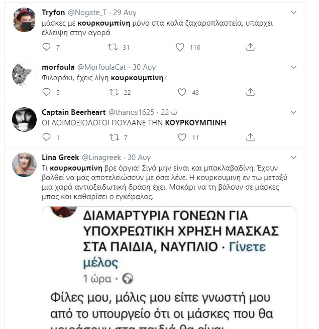 Μία ανάρτηση μητέρας έγινε viral στα social media. Στην εν λόγω ανάρτηση η μητέρα κάνει λόγο για μια ουσία, την «κουρκουμπίνη», που θα ναρκώσει τα παιδιά στο σχολείο, καθώς θα τοποθετηθεί στις μάσκες. «Φίλες μου, μόλις μου είπε γνωστή μου από το υπουργείο οτι οι μάσκες που θα μοιράσουν στα παιδιά θα είναι ποτισμένες με κουρκουμπίνη. Μια ουσία λέει που είναι των Κινέζων και στόχο έχει να κάνει τα παιδιά συνεργάσιμα και ήρεμα. Να μην κάνουν φασαρία κτλ. Θα ναρκώσουν τα παιδιά μας; Εμείς αποφασίσαμε να μην το στείλουμε με μάσκα και αν τελικά τις μοιράσουν θα πληρώσουμε ιδιώτη να κάνει ανάλυση υλικού» έγραψε, προκαλώντας “έκρηξη” σχολίων στο Twitter.