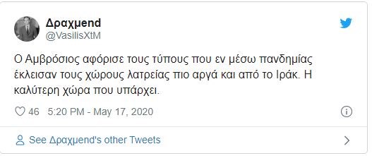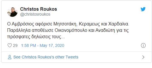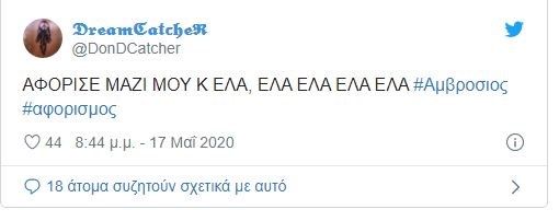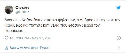 Χαμός έγινε στο Twitter μετά την κίνηση του Μητροπολίτη πρ. Καλαβρύτων κι Αιγιαλείας κ. Αμβρόσιου να αφορίσει τον Πρωθυπουργό, Κυριάκο Μητσοτάκη, την υπουργό Παιδείας, Νίκη Κεραμέως και τον υφυπουργό Πολιτικής Προστασίας, Νίκο Χαρδαλιά. Αφορμή το ότι η υπουργός Παιδείας δεν ανακάλεσε τη δήλωσή της ότι ο κορονοϊός κολλάει με το σάλιο, με τον κ. Αμβρόσιο να θεωρεί ότι αναφερόταν η υπουργός και στη Θεία Κοινωνία. Βέβαια η Ιερά Σύνοδος τον “άδειασε” μετά.