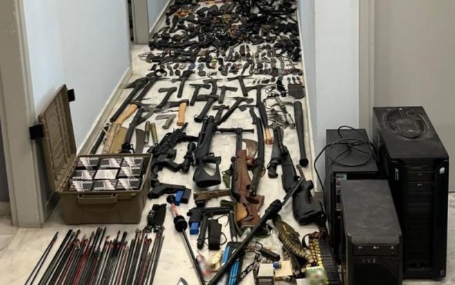 Κατά τη διάρκεια κατ’ οίκον έρευνας, εντοπίστηκε ένα ιδιαίτερα εκτεταμένο και επικίνδυνο οπλοστάσιο, του οποίου η έκταση έχει προκαλέσει εντύπωση ακόμη και στις διωκτικές αρχές.