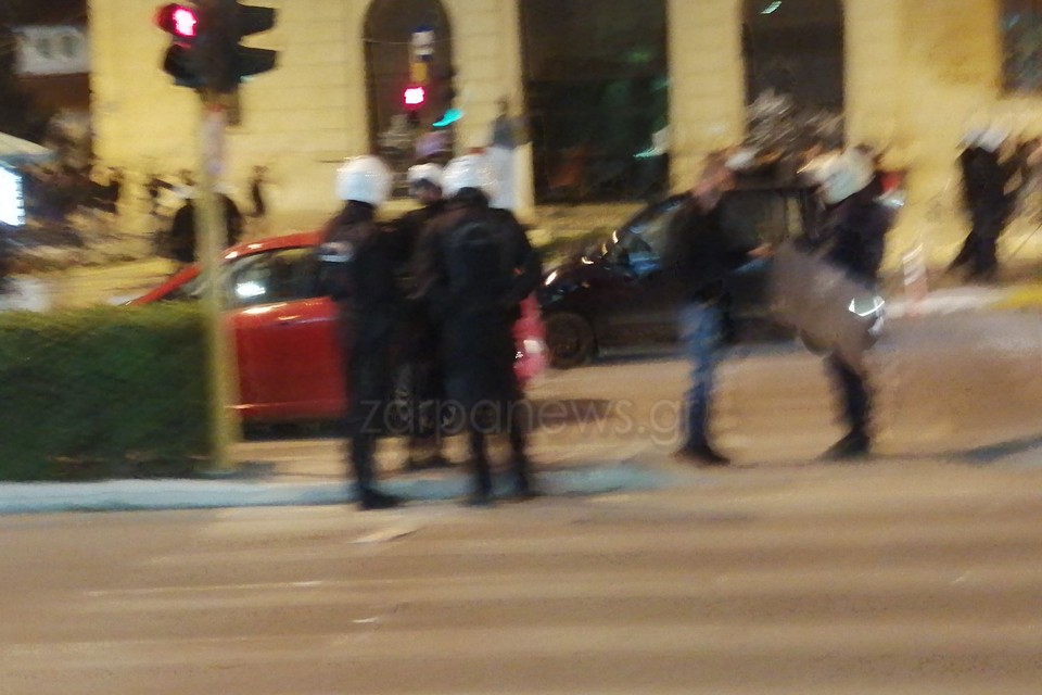 Αργότερα ο όγκος των συγκεντρωμένων νεαρών μετακινήθηκε λίγα μέτρα πιο αριστερά, προς το θέατρο και δυνάμεις των ΜΑΤ, αφού έσβησαν την φωτιά που έκαιγε στη μέση του δρόμου, κυνήγησαν και έτρεψαν σε φυγή τους ταραξίες, που σκόρπισαν στα κοντινά δρομάκια.
