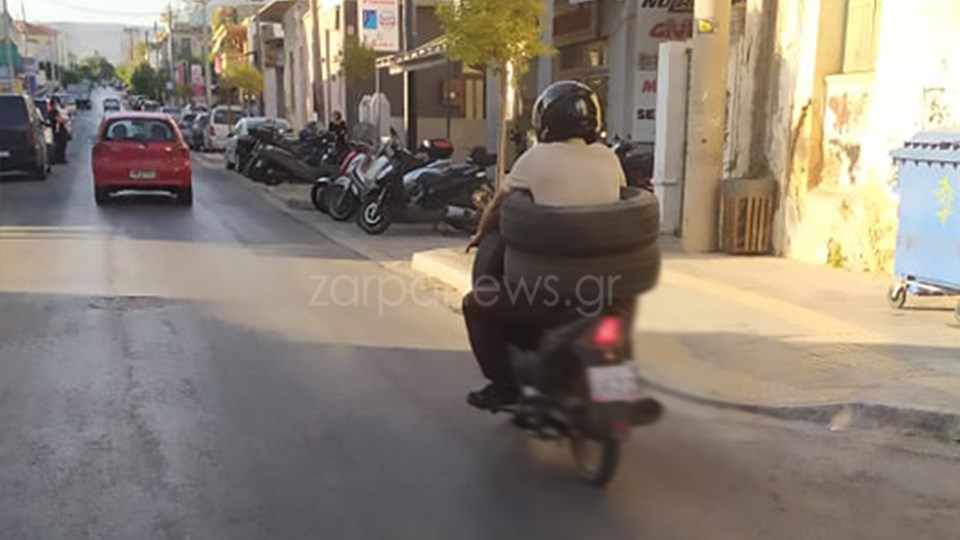 Έκπληκτοι έμειναν οδηγοί και περαστικοί στο κέντρο των Χανίων στην Κρήτη στο θέαμα ενός δικυκλιστή που είχε… φορέσει δύο λάστιχα και πήγαινε ακάθεκτος με άγνωστο προορισμό περνώντας από το κέντρο της πόλης, συγκεκριμένα από την οδό Αποκορώνου. Φαίνεται πως βρήκε έναν δικό του… πρωτότυπο τρόπο για να τα μεταφέρει με το μηχανάκι του, όμως, πολλοί είναι εκείνοι που είπαν ότι η “ασφάλεια πάει περίπατο”. Όπως και να έχει πάντως, ο συγκεκριμένος οδηγός έγινε viral.