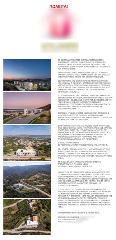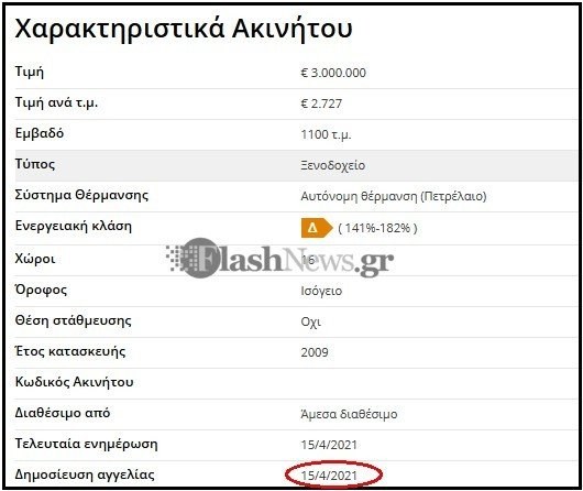 ΠΡΟΤΕΙΝΟΜΕΝΗ ΤΙΜΗ ΠΩΛΗΣΗΣ 3.700.000 ΕΥΡΩ.”, αναφέρεται στην αγγελία πώλησης.