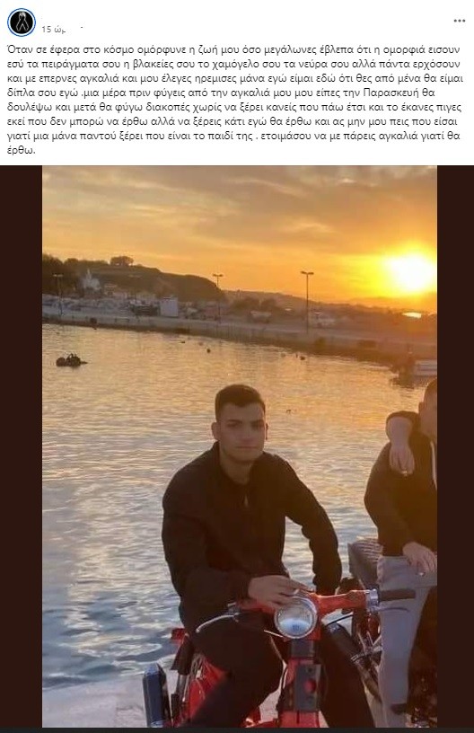 Η μητέρα του 19χρονου Νίκου, ο οποίος άφησε την τελευταία του πνοή στην άσφαλτο, ραγίζει καρδιές σε ανάρτησή της στον προσωπικό της λογαριασμό στο Facebook. «Όταν σε έφερα στον κόσμο ομόρφυνε η ζωή μου όσο μεγάλωνες έβλεπα ότι η ομορφιά ήσουν εσύ, τα πειράγματα σου, οι βλακείες σου, το χαμόγελο σου, τα νεύρα σου αλλά πάντα ερχόσουν και με έπαιρνες αγκαλιά και μου έλεγες ηρέμησε μάνα εγώ είμαι εδώ ότι θες από μένα θα είμαι δίπλα σου εγώ. Μια μέρα πριν φύγεις από την αγκαλιά μου μου είπες την Παρασκευή θα δουλέψω και μετά θα φύγω διακοπές χωρίς να ξέρει κανείς πού πάω έτσι και το έκανες πήγες εκεί που δεν μπορώ να έρθω αλλά να ξέρεις κάτι εγώ θα έρθω και ας μην μου πεις που είσαι γιατί μια μάνα παντού ξέρει πού είναι το παιδί της. Ετοιμάσου να με πάρεις αγκαλιά γιατί θα έρθω».