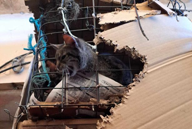 Στο χώρο της αυλής αλλά και μέσα στο σπίτι, πέραν των σκουπιδιών και της βρωμιάς που επικρατούσε, υπάρχουν αυτοσχέδια ξύλινα κουτιά, κλουβιά από παλέτες σκεπασμένα με χαρτόκουτες και νάιλον, συρμάτινα σκουριασμένα κλουβιά καλυμμένα εντελώς, στα οποία μέσα ζουν στρυμωγμένες (ανά ομάδες) 77 ΓΆΤΕΣ!!! Οι γάτες ζουν στο σκοτάδι, πολλές φαίνονται άρρωστες και οι περισσότερες δεν είχαν χώρο καν να κουνηθούν.