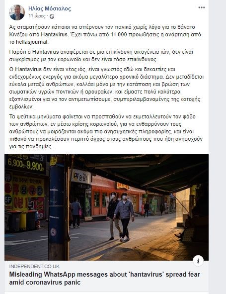 Καθησυχαστικός εμφανίζεται ο καθηγητής Πολιτικής της Υγείας στο London School of Economics, Ηλίας Μόσιαλος, αναφορικά με τον χανταϊό, ο οποίος προκάλεσε ανησυχία έπειτα από έναν θάνατο που καταγράφηκε στην Κίνα. Ο κ. Μόσιαλος ζητά να σταματήσουν κάποιοι να σπείρουν τον πανικό χωρίς λόγο για το θάνατο Κινέζου από Hantavirus, ενώ σημειώνει ότι παρότι αναφέρεται σε μια επικίνδυνη οικογένεια ιών, δεν είναι συγκρίσιμος με τον κορονοϊο και δεν είναι τόσο επικίνδυνος.
