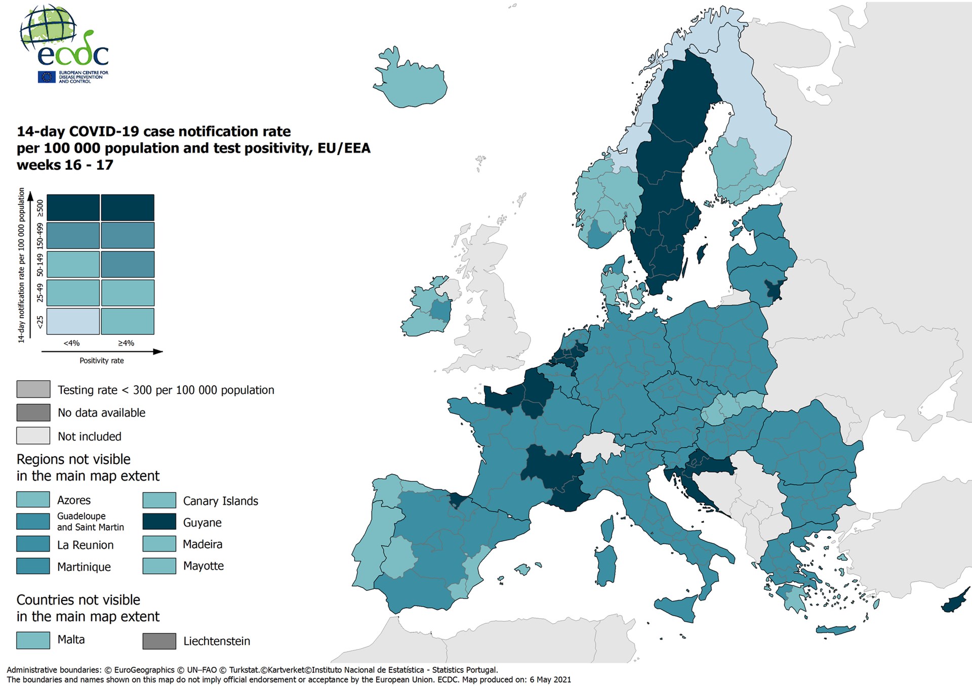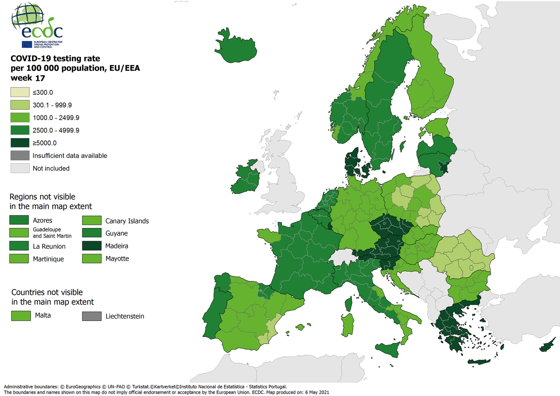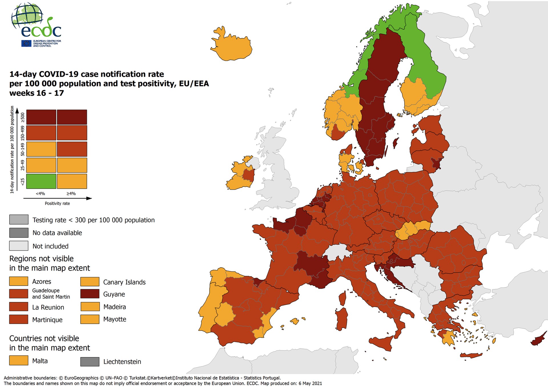 Σύμφωνα με το ECDC, πράσινο χρώμα έχουν οι χώρες εάν το ποσοστό ειδοποίησης 14 ημερών είναι χαμηλότερο από 25 περιπτώσεις ανά 100.000 και το ποσοστό θετικότητας δοκιμής κάτω από 4%.