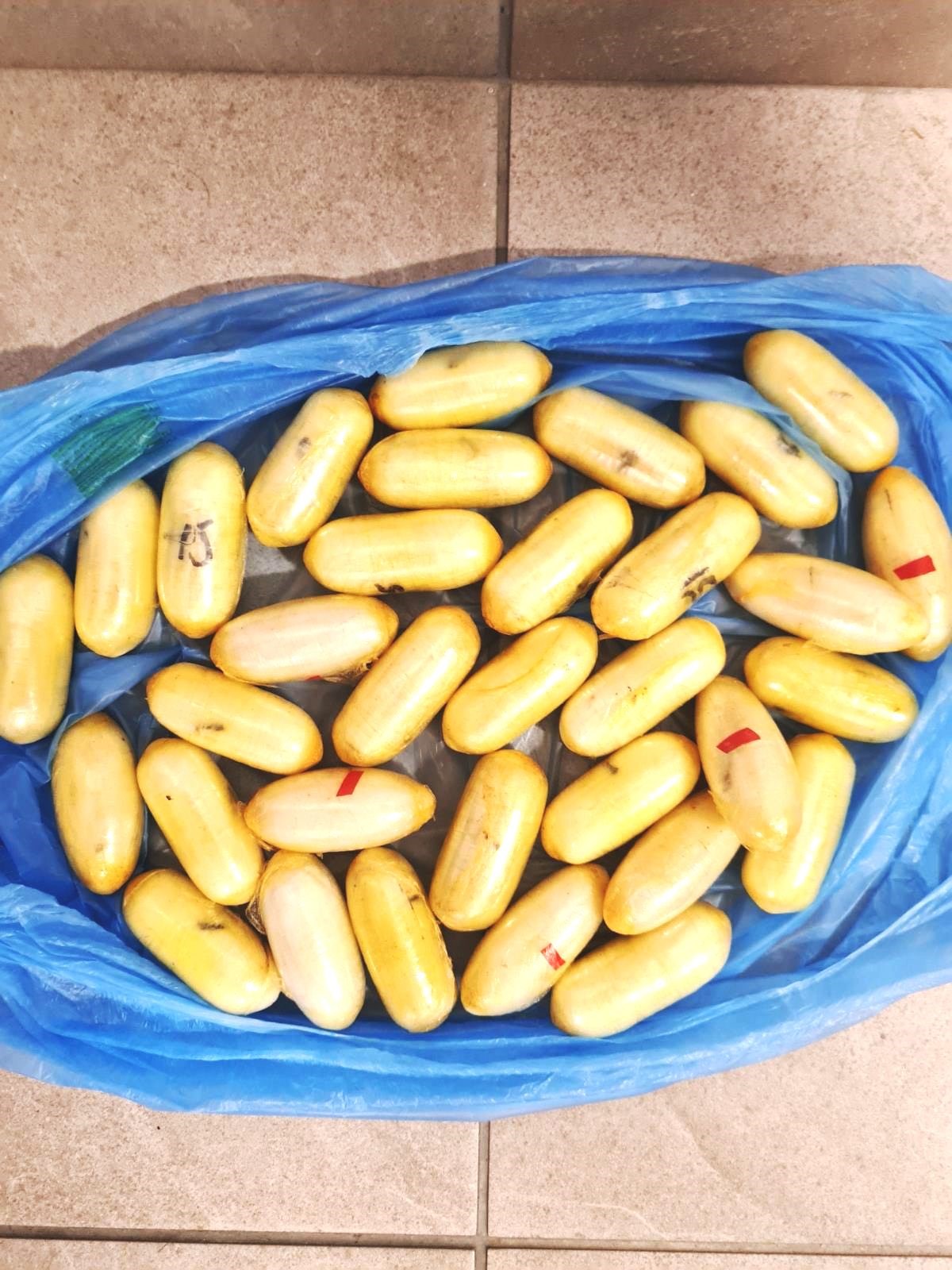 Ο 32χρονος μετέφερε, δια της μεθόδου της καταπόσεως, ποσότητα κοκαΐνης σε 33 αυτοσχέδιες συσκευασίες, συνολικού βάρους 520 γραμμαρίων, οι οποίες και κατασχέθηκαν.