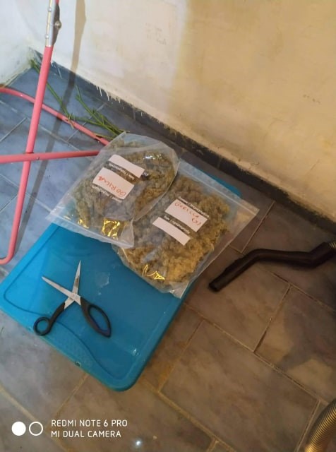 Στην οικία που ενοικίαζε στην περιοχή της Τούμπας και χρησιμοποιούσε ως χώρο απόκρυψης των ναρκωτικών, κατείχε:• πλήρη εξοπλισμό υδροπονικής καλλιέργειας δενδρυλλίων κάνναβης αποτελούμενο από συστήματα εξαερισμού, φωτισμού και λίπανσης,• 220 γραμμάρια ακατέργαστης κάνναβης σε φούντα,• 37 δενδρύλλια κάνναβης,