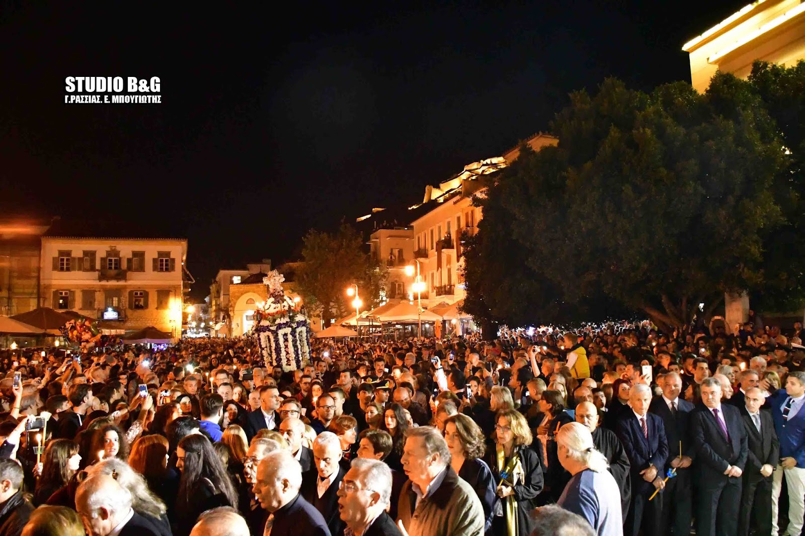 Ένα τεράστιο ποτάμι από πιστούς κατέκλυσε την ιστορική πλατεία Συντάγματος στο Ναύπλιο τη Μεγάλη Παρασκευή 26 Απριλίου 2019 κατά την συνάντηση των επιτάφιων.
