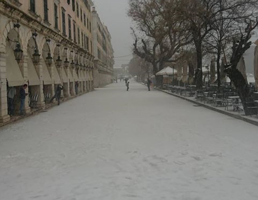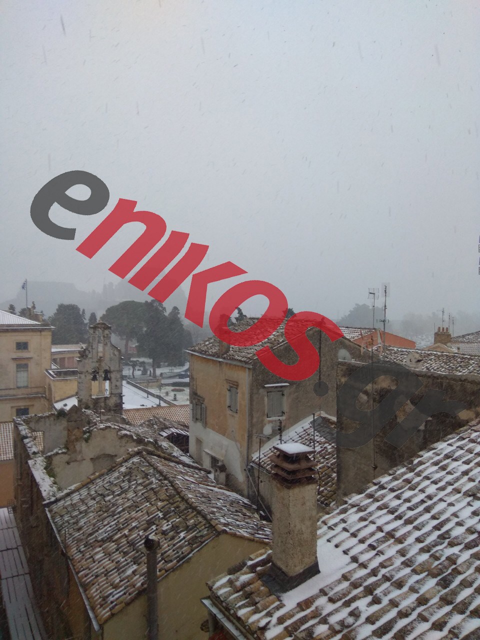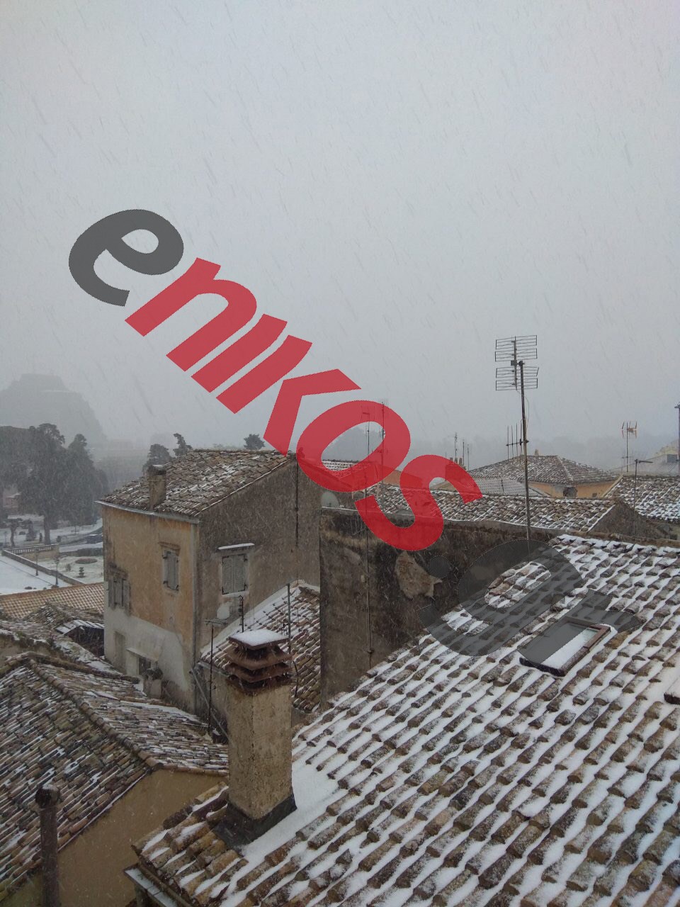 Την ίδια ώρα στις παρυφές της πόλης σημειώνεται χιονόπτωση, με τους Κερκυραίους να απολαμβάνουν το φυσικό φαινόμενο καθώς σπάνια έχουν την ευκαιρία να δουν και να νιώσουν το χιόνι.
