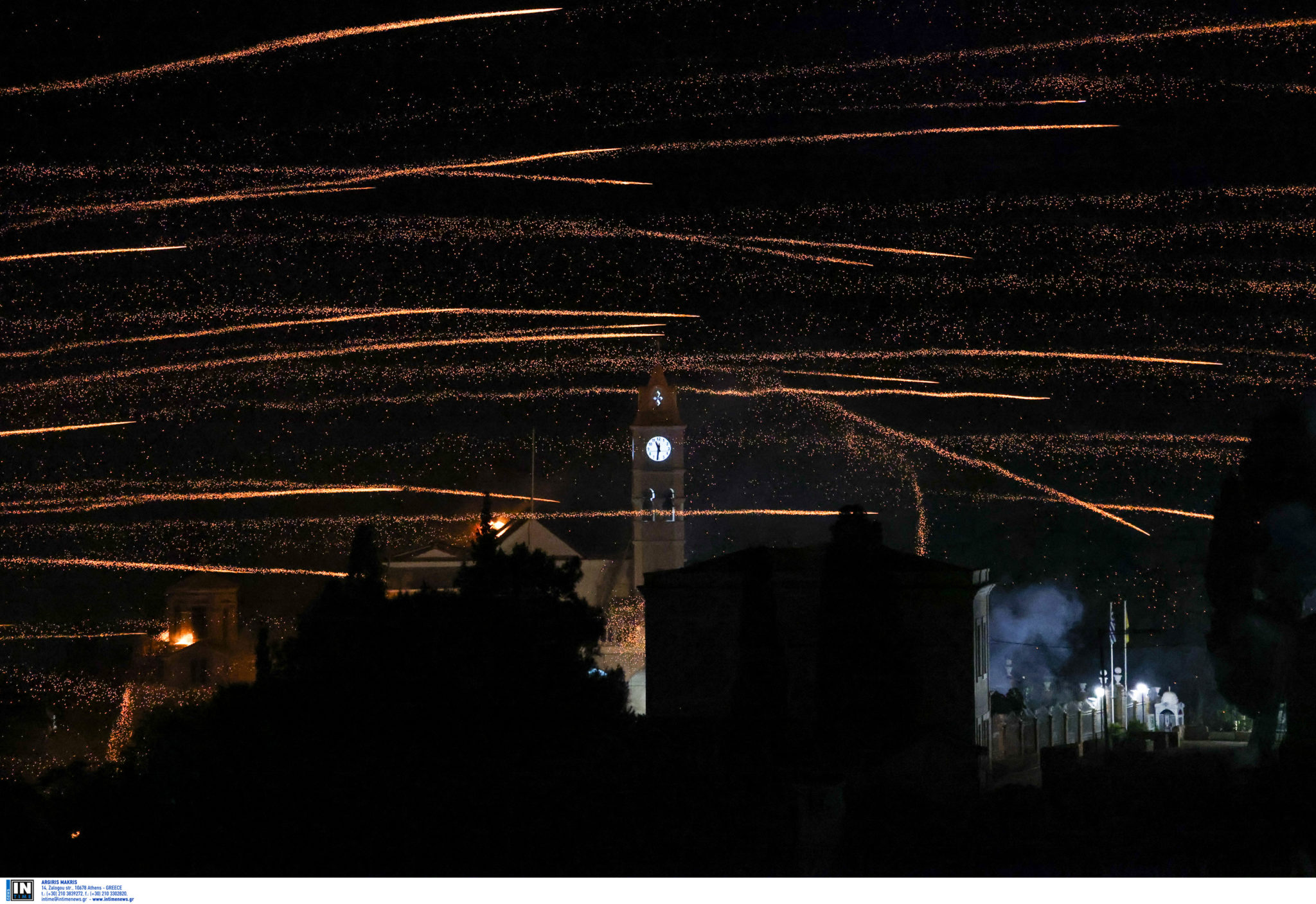 Μόλις οι καμπάνες σήμαναν 11 το βράδυ, οι πρώτες μαζικές ρίψεις έκαναν τη νύχτα μέρα ενώ μία ώρα αργότερα οι ρουκέτες μαζί με εκατοντάδες πυροτεχνήματα μετέφεραν το χαρμόσυνο μήνυμα της Ανάστασης του Κυρίου.