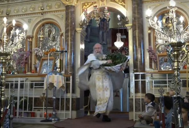 Λίγο μετά τις 8:30 π.μ., το ιερό άνοιξε και ο ιερέας εξήλθε ραντίζοντας με δαφνόφυλλα τους πιστούς, ενώ παράλληλα οι παρευρισκόμενοι χτυπούσαν με δύναμη τα στασίδια, όπως ορίζει το έθιμο, δημιουργώντας μια εκκωφαντική αλλά πανηγυρική ατμόσφαιρα.