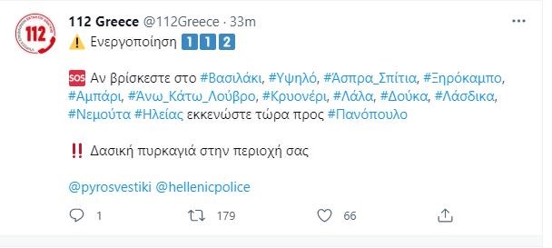 Συγκεκριμένα μήνυμα εστάλη σε όσους βρίσκονται σε Βασιλάκι, Υψηλό, Άσπρα Σπίτια, Ξηρόκαμπο, Αμπάρι, Άνω-Κάτω Λούβρο, Κρυονέρι, Λάλα, Δούκα, Λάσδικα, Νεμούτα Ηλείας να εκκενώσουν τώρα τους οικισμούς τους λόγω δασικής πυρκαγιάς στην περιοχή. Το μήνυμα αναφέρει: «Αν βρίσκεστε στο Βασιλάκι, Υψηλό, ‘Ασπρα Σπίτια, Ξηρόκαμπο, Αμπάρι, ‘Ανω-Κάτω Λούβρο, Κρυονέρι, Λάλα, Δούκα, Λάσδικα, Νεμούτα εκκενώστε τώρα προς Πανόπουλο. Δασική πυρκαγιά στην περιοχή σας».