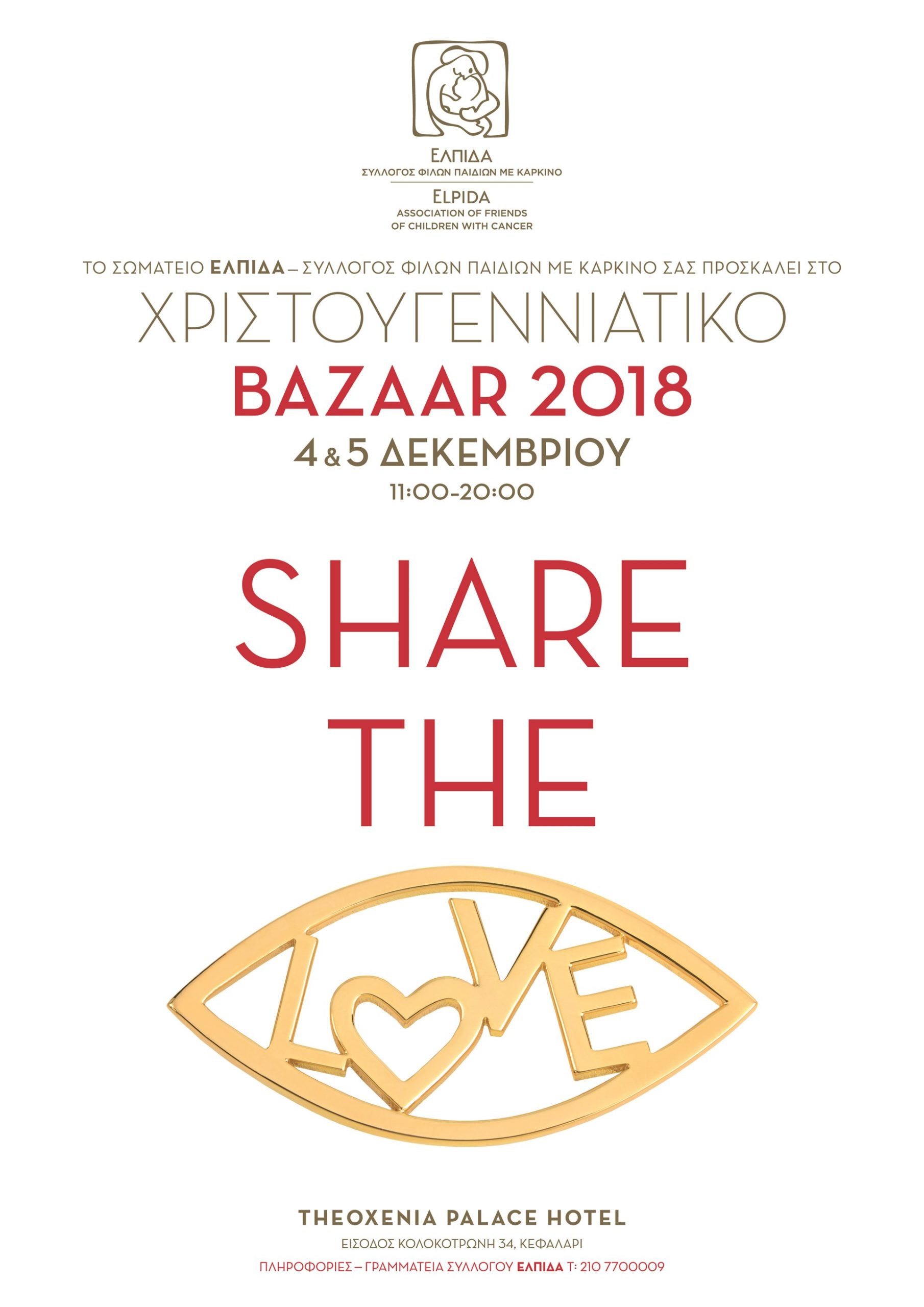 Με κεντρικό σύνθημα «Share the Love», το Σωματείο «ΕΛΠΙΔΑ -Σύλλογος Φίλων Παιδιών με καρκίνο» διοργανώνει για 14η συνεχή χρονιά το πιο Χριστουγεννιάτικο Βazaar της πόλης, Τρίτη 4 και Τετάρτη 5 Δεκεμβρίου στο ξενοδοχείο «Theoxenia Palace» στο Κεφαλάρι από τις 11 το πρωί μέχρι τις 8 το βράδυ!