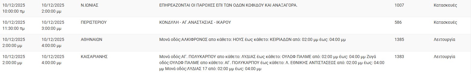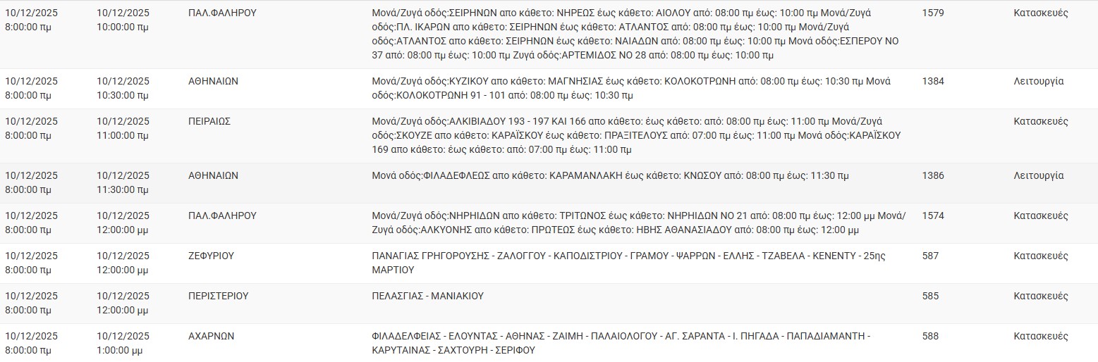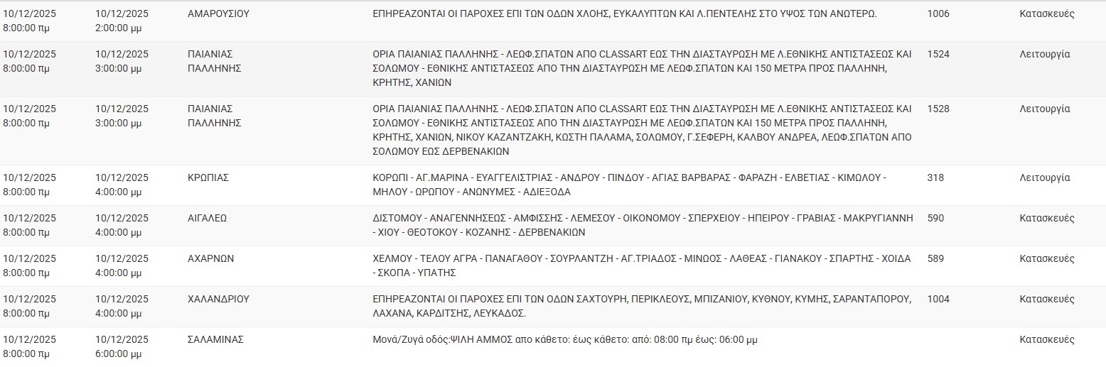 Διακοπές ρεύματος έχει προγραμματίσει για σήμερα, Τετάρτη 10 Δεκεμβρίου 2025, ο ΔΕΔΔΗΕ σε διάφορες περιοχές της Αττικής.
