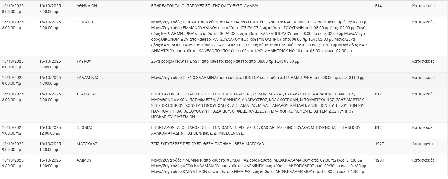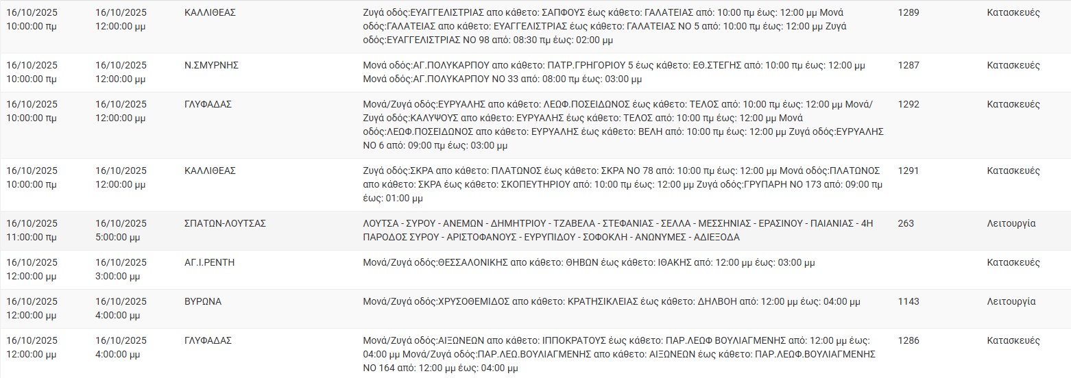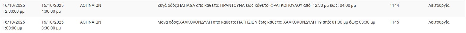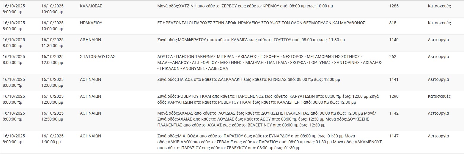 ΔΕΔΔΗΕ: Διακοπές ρεύματος σήμερα (16/10) στην Αθήνα και σε άλλες 15 περιοχές της Αττικής