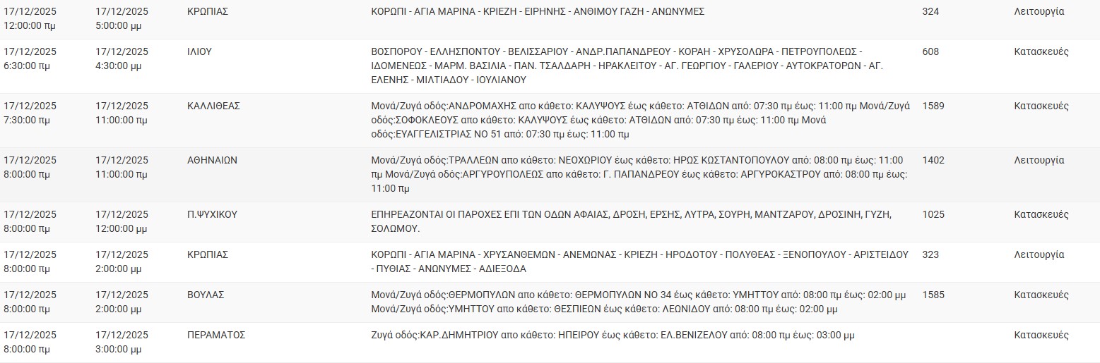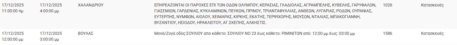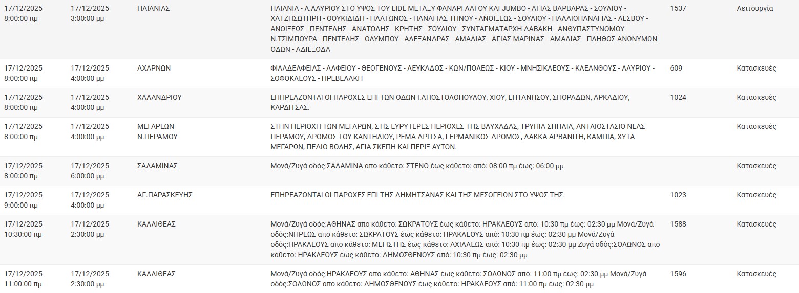 Διακοπές ρεύματος έχει προγραμματίσει για σήμερα, Τετάρτη 17 Δεκεμβρίου 2025, ο ΔΕΔΔΗΕ σε διάφορες περιοχές της Αττικής.