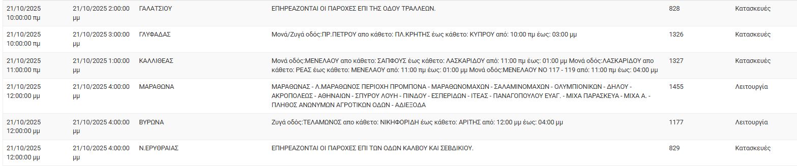 Διακοπές ρεύματος έχει προγραμματίσει για σήμερα, Τρίτη 21 Οκτωβρίου, ο ΔΕΔΔΗΕ σε διάφορες περιοχές της Αττικής.