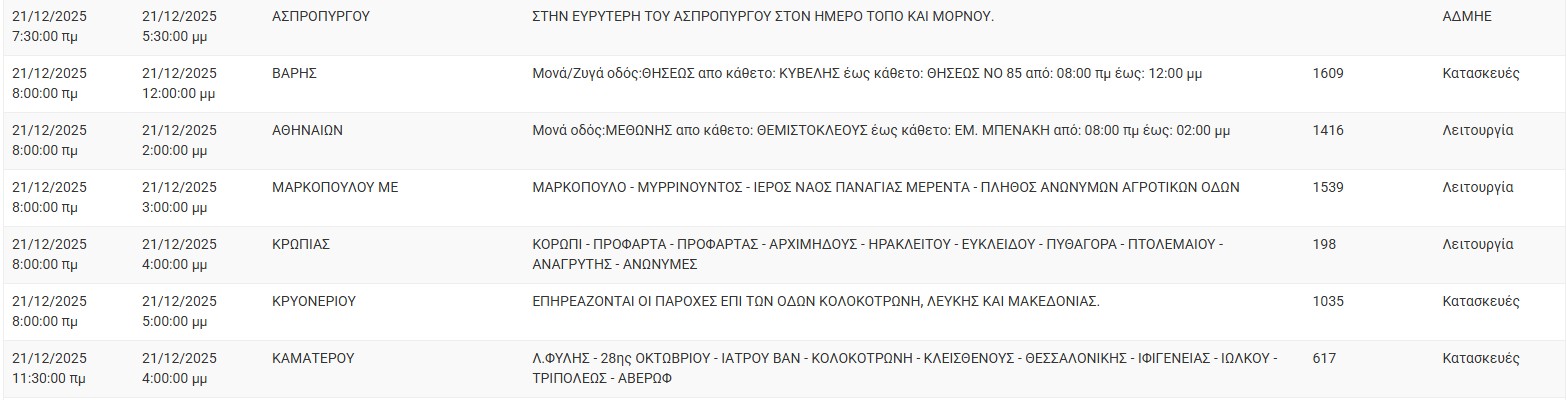 Διακοπές ρεύματος έχει προγραμματίσει για σήμερα, Κυριακή 21 Δεκεμβρίου 2025, ο ΔΕΔΔΗΕ σε διάφορες περιοχές της Αττικής.