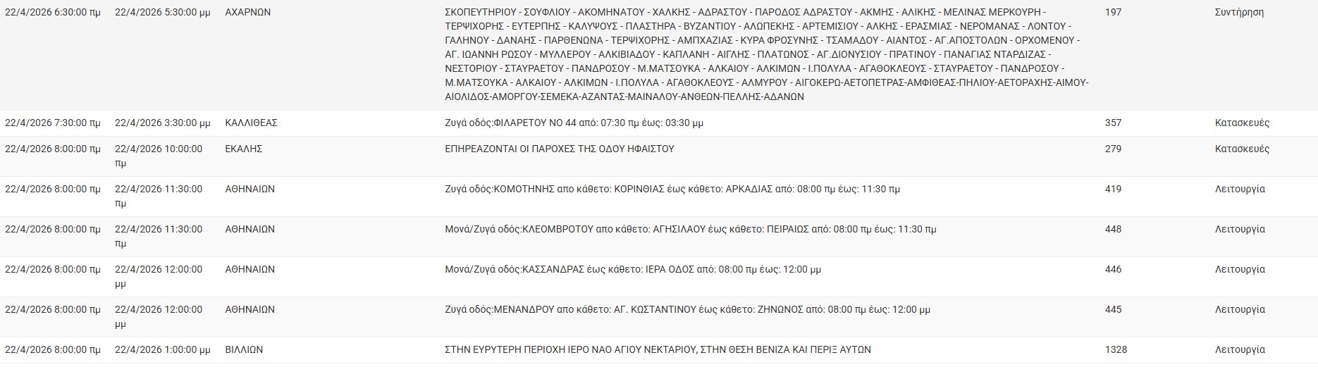 Διακοπές ρεύματος έχει προγραμματίσει για σήμερα, Τετάρτη 22 Απριλίου 2026, ο ΔΕΔΔΗΕ σε διάφορες περιοχές της Αττικής.