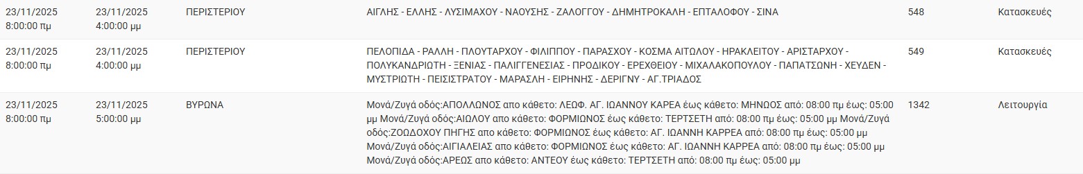 Διακοπές ρεύματος έχει προγραμματίσει για σήμερα, Κυριακή 23 Νοεμβρίου, ο ΔΕΔΔΗΕ σε διάφορες περιοχές της Αττικής.