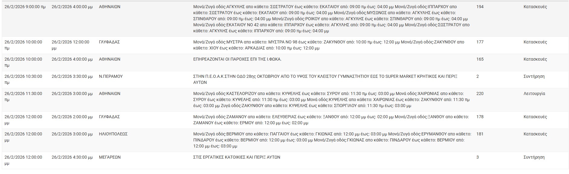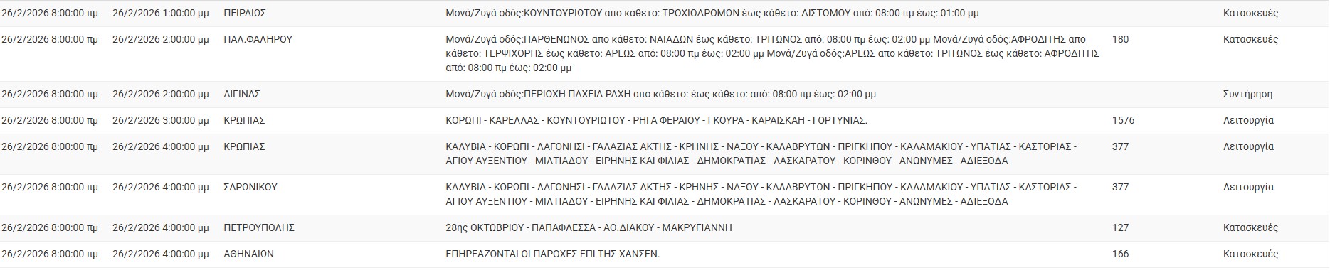 ΔΕΔΔΗΕ: Διακοπές ρεύματος σήμερα (26/2) στην Αθήνα και σε άλλες 14 περιοχές της Αττικής