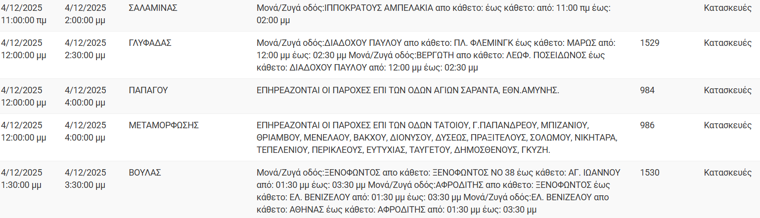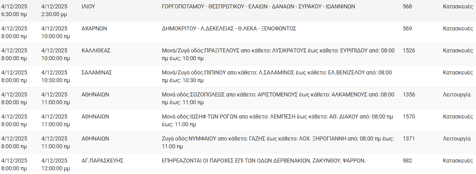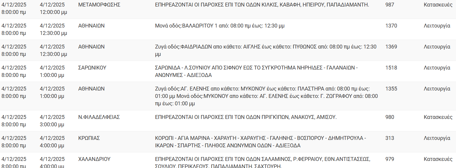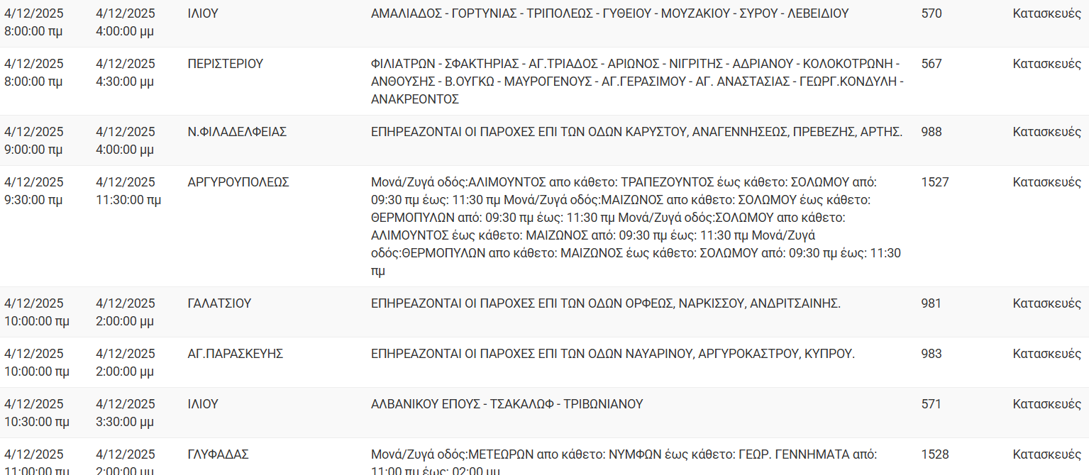 Διακοπές ρεύματος έχει προγραμματίσει για σήμερα, Πέμπτη 4 Δεκεμβρίου 2025, ο ΔΕΔΔΗΕ σε διάφορες περιοχές της Αττικής.