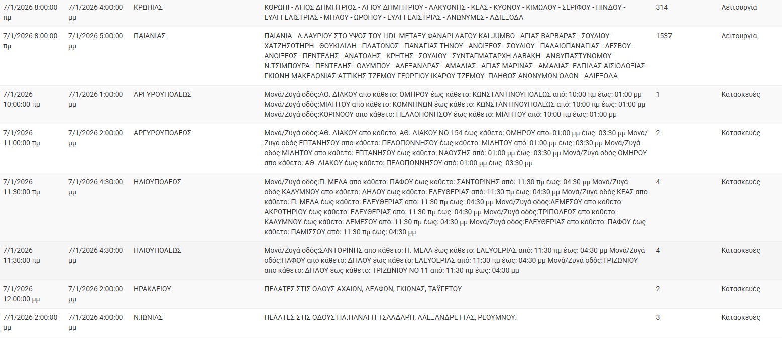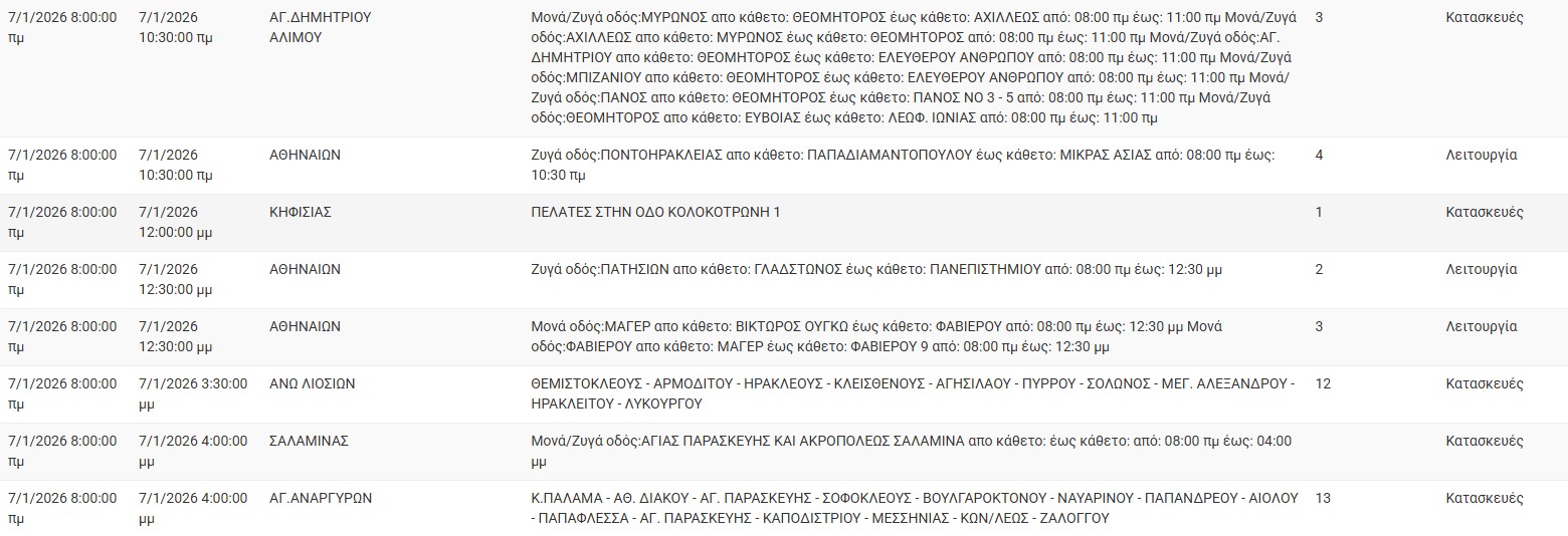 • Οι περιοχές που επηρεάζονται περιλαμβάνουν την Αθήνα, τον Άγιο Δημήτριο, τον Άλιμο, την Κηφισιά, τη Σαλαμίνα και την Αργυρούπολη, μεταξύ άλλων.