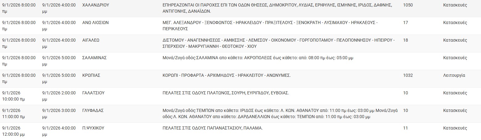 Διακοπές ρεύματος έχει προγραμματίσει για σήμερα, Παρασκευή 9 Ιανουαρίου 2026, ο ΔΕΔΔΗΕ σε διάφορες περιοχές της Αττικής.