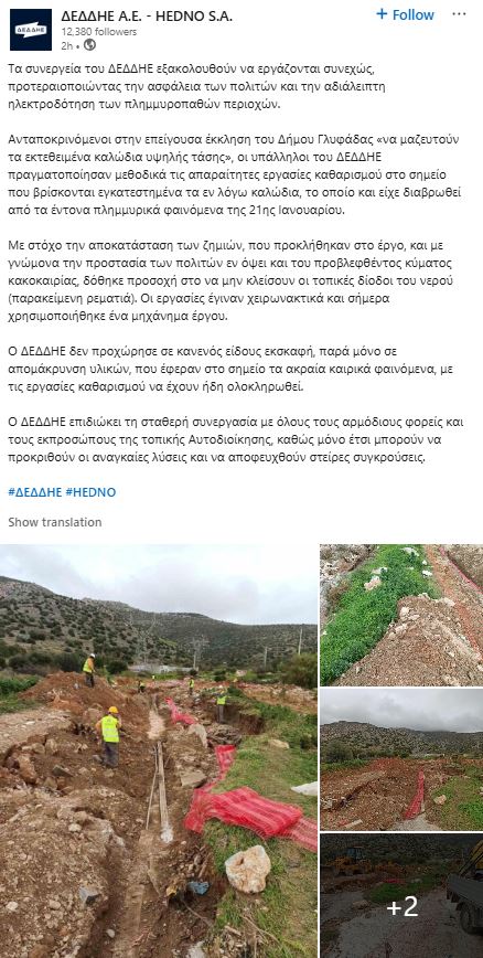 «Τα συνεργεία του ΔΕΔΔΗΕ εξακολουθούν να εργάζονται συνεχώς, προτεραιοποιώντας την ασφάλεια των πολιτών και την αδιάλειπτη ηλεκτροδότηση των πλημμυροπαθών περιοχών.