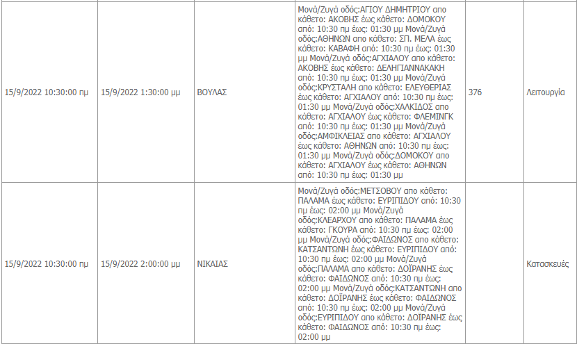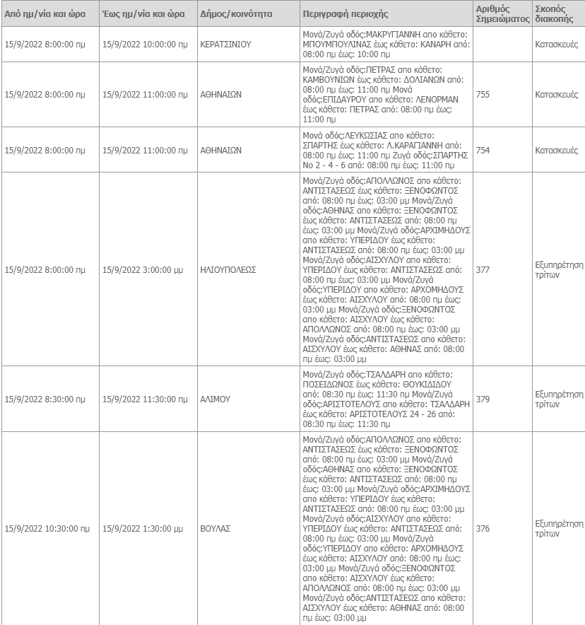 Δείτε εδώ αναλυτικά τις περιοχές και τις ώρες