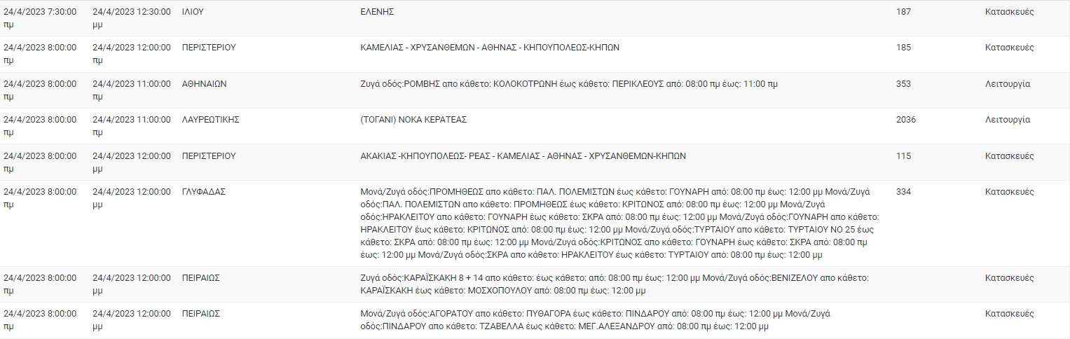Συγκεκριμένα, όπως αναφέρει ο ΔΕΔΔΗΕ θα υπάρξουν προγραμματισμένες διακοπές ρεύματος σε περιοχές του Ιλίου, του Περιστερίου, της Αθήνας, του Λαυρίου, της Γλυφάδας, του Πειραιά, του Ζωγράφου, του Παλαιού Φαλήρου, του Μαραθώνα, Σαρωνικού, του Χαλανδρίου, των Μεγάρων και της Νέας Σμύρνης.