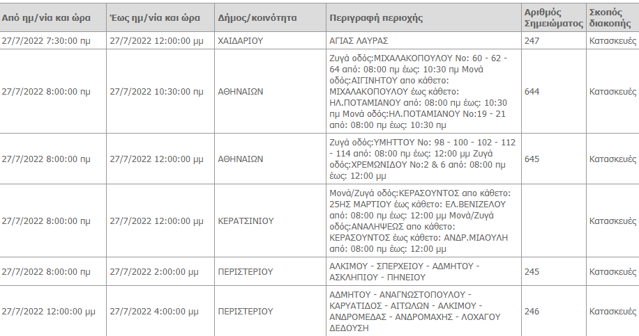 Σύμφωνα με τον ΔΕΔΔΗΕ, διακοπές θα υπάρξουν σε περιοχές του Χαϊδαρίου, του Κερατσινίου, του Περιστερίου και της Αθήνας