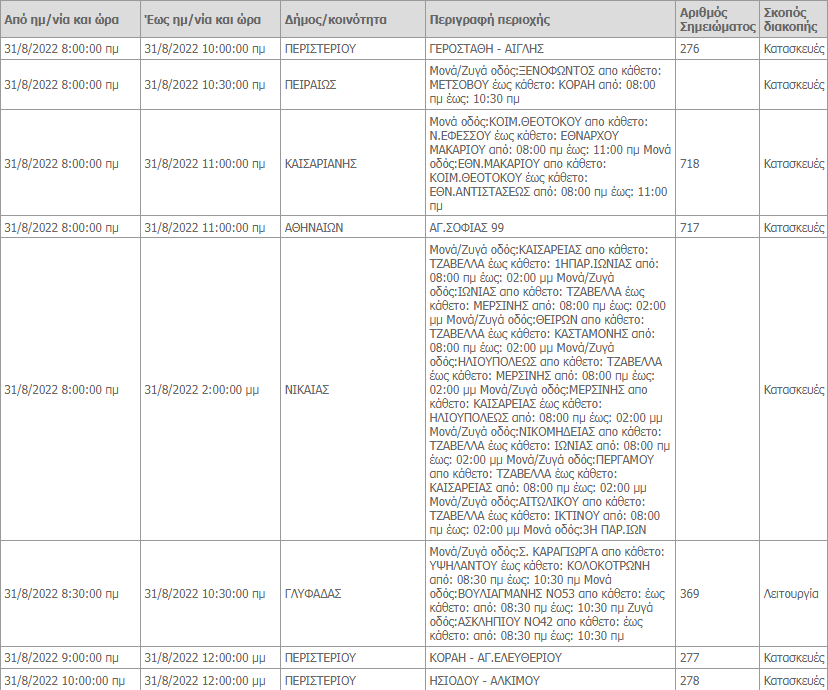 Δείτε εδώ αναλυτικά τις περιοχές και τις ώρες