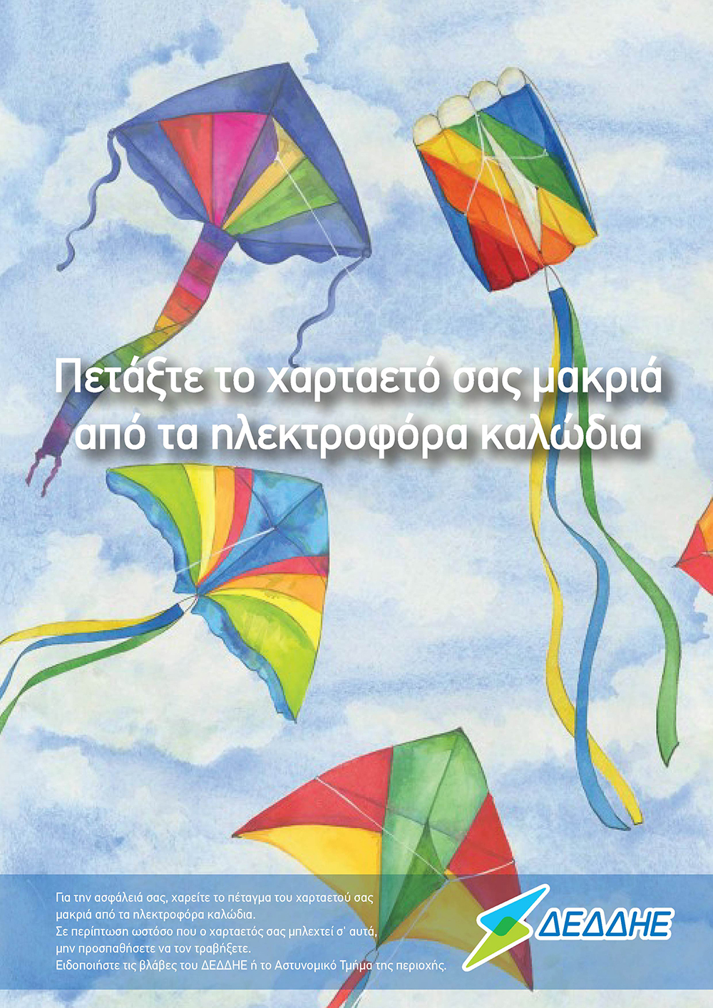 “Μην πετάτε το χαρταετό σας κοντά σε ηλεκτροφόρα καλώδια”, αναφέρει η αφίσα της καμπάνιας, καθώς υπάρχει σοβαρός κίνδυνος ηλεκτροπληξίας αλλά και διακοπής της παροχής ρεύματος στη γύρω περιοχή.