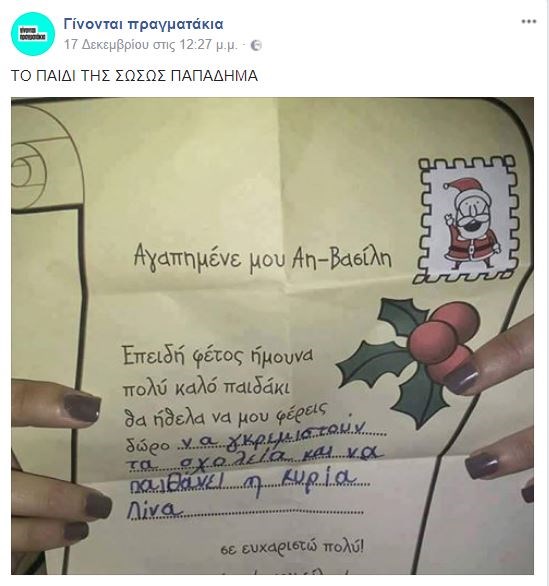 Το γράμμα ενός παιδιού στον Άγιο Βασίλη κάνει τον γύρου τουδιαδικτύου. Το παιδί που συνέταξε την επιστολή προς τον αγαπημένο Άγιο όλων προφανώς περνάει δύσκολα στο σχολείου και δεν του πολυαρέσει να πηγαίνει.Φωτογραφία που αναρτήθηκε από χρήστη στο Facebook δείχνει το γράμμα ενός μαθητή, στο οποίο ζητάει από τον Άη Βασίλη «να γκρεμιστούν τα σχολεία και να πεθάνει η κυρία Λίνα». Δείτε τη φωτογραφία: