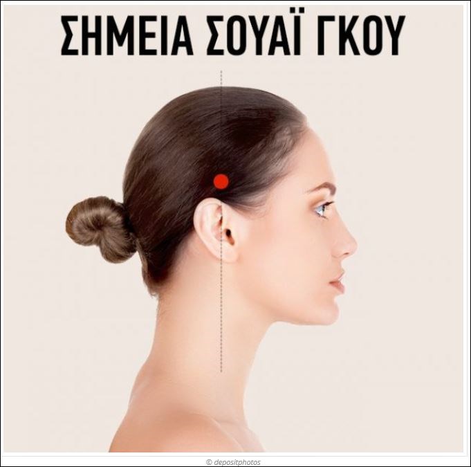 Τα σημεία αυτά βρίσκονται 2-3 εκατοστά από την γραμμή των μαλλιών στους κροτάφους. Νιώστε ένα μικρό λακκάκι για να βρείτε το σημείο. Η πίεση που εφαρμόζεται σε αυτό το σημείο ανακουφίζει τον πόνο από τους κροτάφους και τα μάτια.