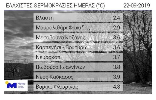Ιδιαίτερα αισθητή έχει γίνει η πτώση της θερμοκρασίας σε ολόκληρη τη χώρα. Νωρίς το πρωί πολύ χαμηλές ελάχιστες θερμοκρασίες σημειώθηκαν στα ορεινά και ημιορεινά ηπειρωτικά, αλλά και σε περιοχές της Μακεδονίας με χαμηλό υψόμετρο.