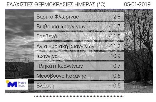 Αναλυτικότερα, σύμφωνα με το δίκτυο αυτόματων μετεωρολογικών σταθμών του Εθνικού Αστεροσκοπείου Αθηνών/Meteo, οι οκτώ χαμηλότερες θερμοκρασίες σημειώθηκαν στο Βαρικό Φλώρινας (-12,8), στη Βωβούσα Ιωαννίνων (-11,7), στα Γρεβενά (-11,5), στην Αγία Κυριακή Ιωαννίνων (-11,2), στα Ιωάννινα (-10,9), στο Πληκάτι Ιωαννίνων (-10,7), στο Μεσόβουνο Κοζάνης (-10,6) και στη Βλάστη Κοζάνης (-10,5).