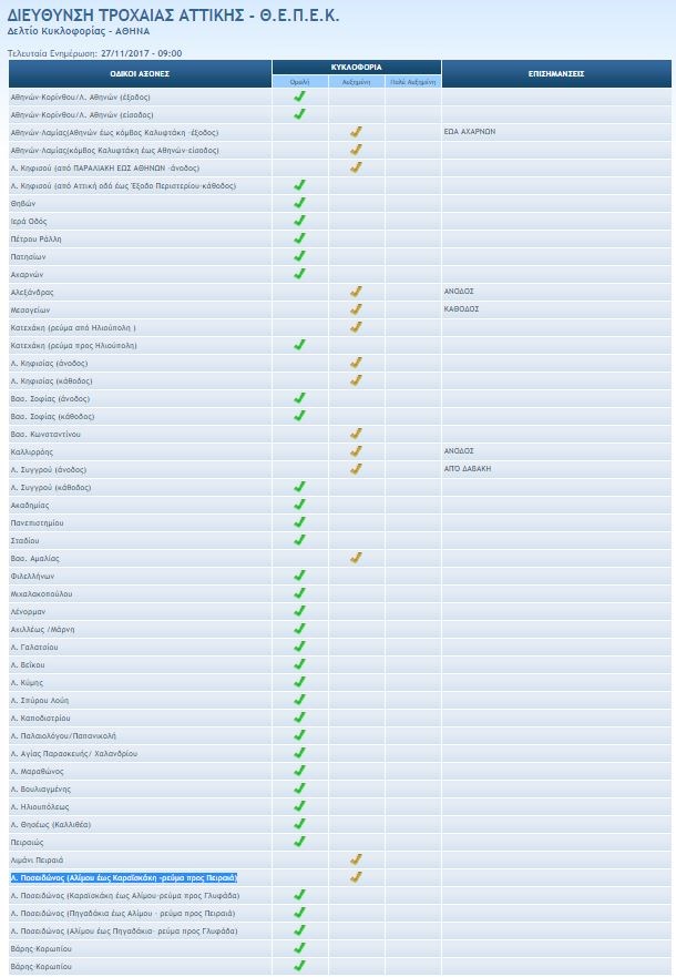 Συγκεκριμένα, σύμφωνα με την Τροχαία, προβλήματα αντιμετωπίζουν οι οδηγοί που κινούνται στην Αθηνών-Λαμίας, στη λεωφόρο Κηφισού (από Παραλιακή έως Αθηνών -άνοδος), στην άνοδο της Αλεξάνδρας, στην κάθοδο της Μεσογείων, στην Κατεχάκη, στη λεωφόρο Κηφισίας, στη λεωφόρο Βασιλέως Κωνσταντίνου, στην άνοδο της Καλλιρρόης και της λεωφόρου Συγγρού, στη Βασιλίσσης Αμαλίας και στη λεωφόρο Ποσειδώνος (Αλίμου έως Καραϊσκάκη – στο ρεύμα προς Πειραιά).