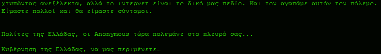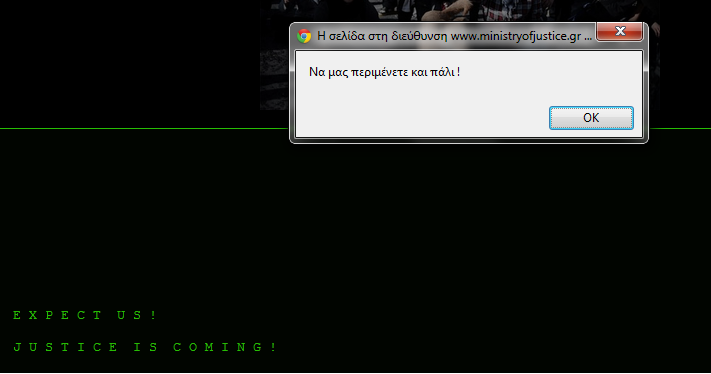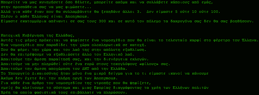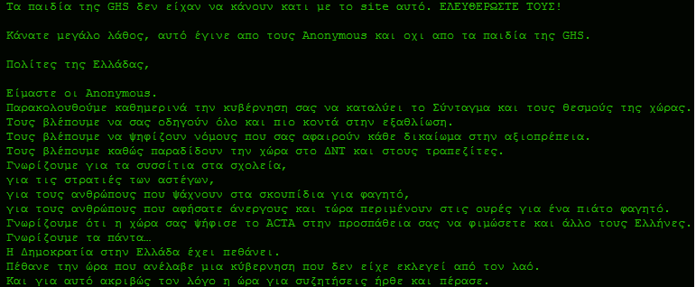 Διαβάστε το μήνυμα των Anonymous στην ιστοσελίδα του Υπουργείου Δικαιοσύνης Με την είσοδο στην ιστοσελίδα ακούγονται τα λόγια του αμερικανού κωμικού George Carlin-” Οι πολιτικοί υπάρχουν για να νομίζετε ότι έχετε ελευθερία επιλογής. Δεν έχετε. Έχετε ιδιοκτήτες. Τους ανήκετε” Στη συνέχεια αναλαμβάνουν την ευθύνη για τα “χτυπήματα” και ζητούν την ελευθερία των μελών της GHS(Greek Hacking Society) τα οποία θεωρήθηκαν υπεύθυνοι για τις κινήσεις αυτες.Διαβάστε το πλήρες μήνυμα των Anonymous.