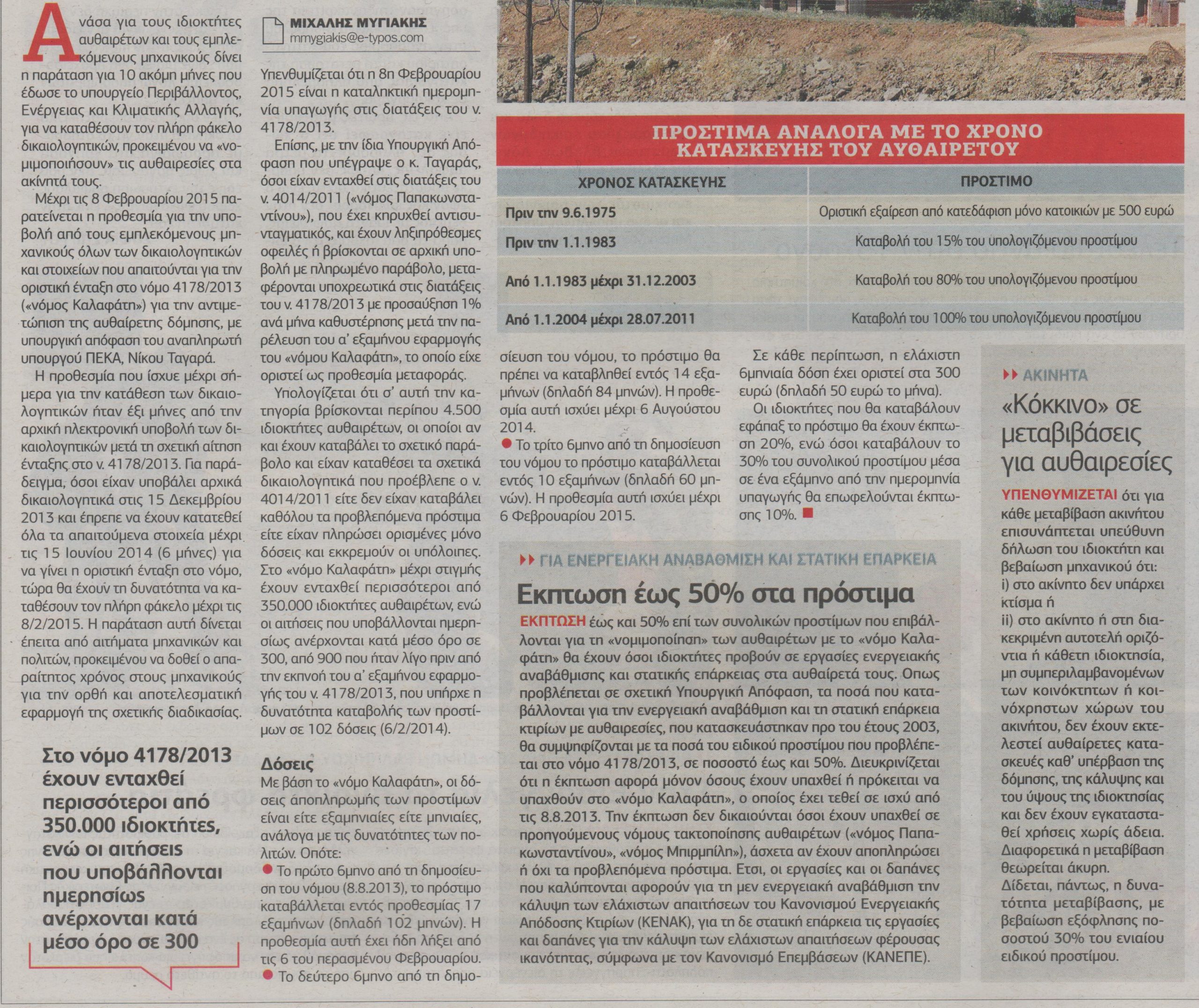Μέχρι τις 8 Φεβρουαρίου 2015 παρατείνεται η προθεσμία για την υποβολή από τους εμπλεκόμενους μηχανικούς όλων των δικαιολογητικών και στοιχείων που απαιτούνται για την οριστική ένταξη στο νόμο 4178/2013 («νόμος Καλαφάτη») για την αντιμετώπιση της αυθαίρετης δόμησης, με υπουργική απόφαση του αναπληρωτή υπουργού ΠΕΚΑ, Νίκου Ταγαρά.