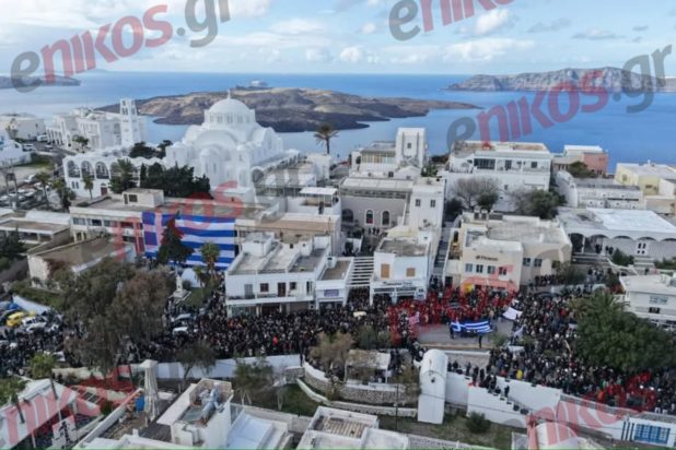 Η Σαντορίνη τιμά τη μνήμη των θυμάτων της τραγωδίας στα Τέμπη, με την τοπική κοινωνία να δίνει το δικό της «παρών». Φωτογραφία ενός αναγνώστη του enikos.gr, επιβεβαιώνει την ηχηρή παρουσία του κόσμου, στα πλαίσια των συλλαλητηρίων που λαμβάνουν χώρα σήμερα σε ολόκληρη την Ελλάδα, αλλά και στο εξωτερικό.